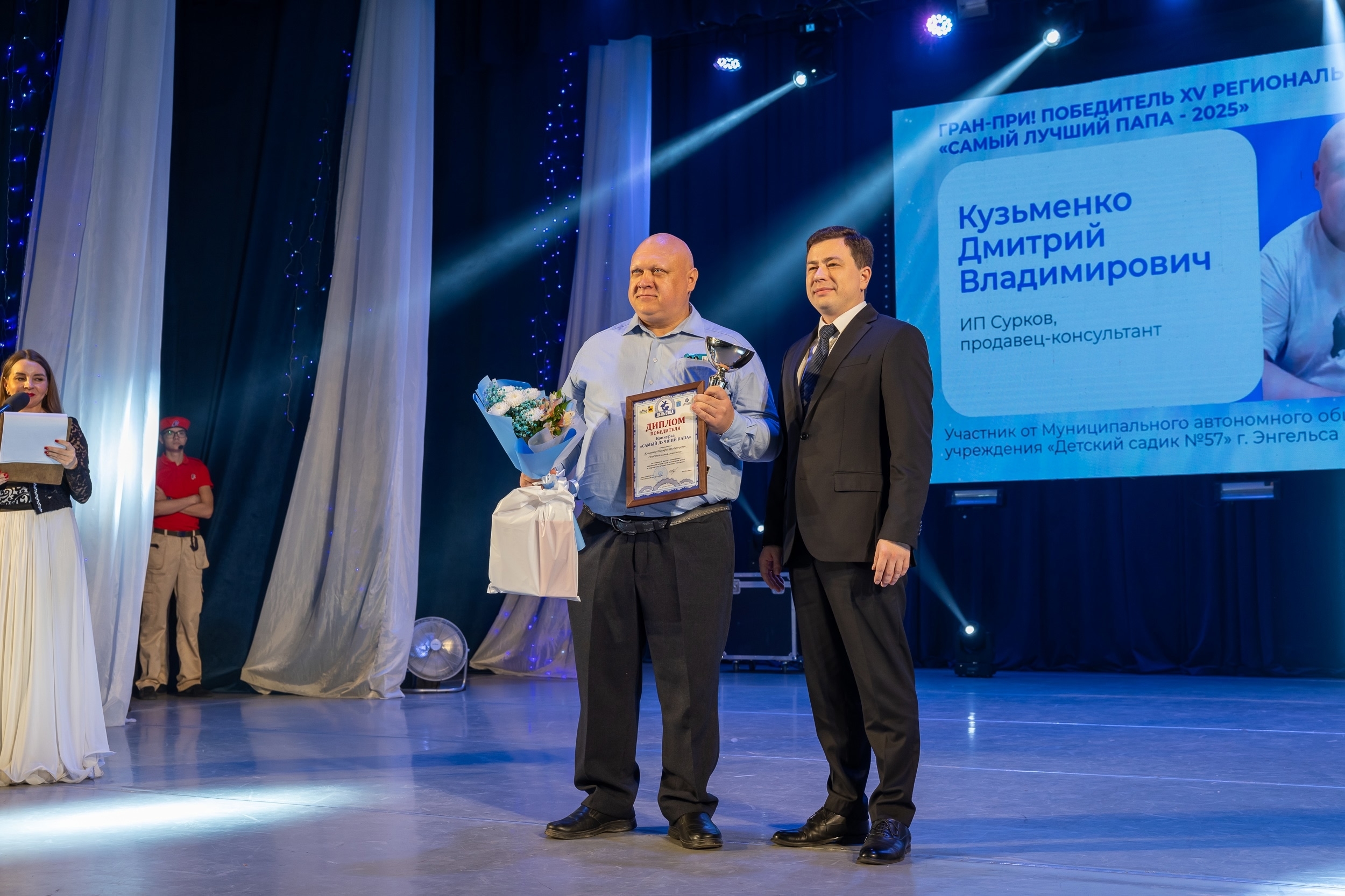 Состоялось награждение победителей семейного конкурса «Самый лучший папа - 2025» в ЦНТ «Дружба». Министр труда и социальной защиты Саратовской области Денис Давыдов выразил слова благодарности всем участникам конкурса и вручил памятные подарки и переходящий кубок победителя лучшему папе, обладателю Гран-при конкурса Дмитрию Кузьменко, который работает продавцом-консультантом в Магазине автомобильных запасных частей.